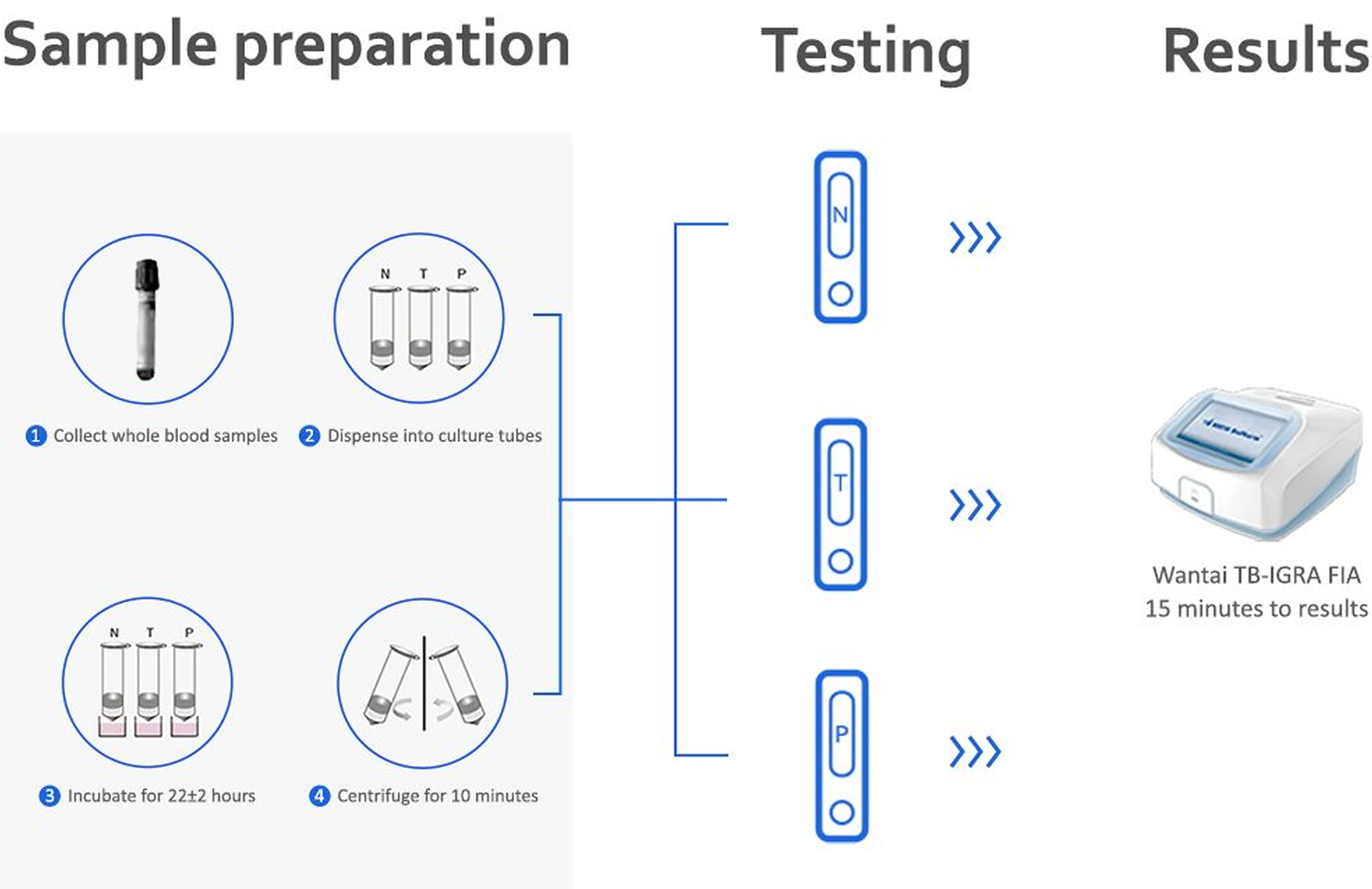 Wantai’s TB-IGRA FIA is intended for use as an aid in the diagnosis of TB infection including both latent Tuberculosis infection and Tuberculosis disease. Wantai’s TB-IGRA FIA is a fluorescence semi-quantitative test for detection of Interferon Gamma (IFN-γ) that responds to in-vitro stimulation by Mycobacterium Tuberculosis antigens in human blood samples.